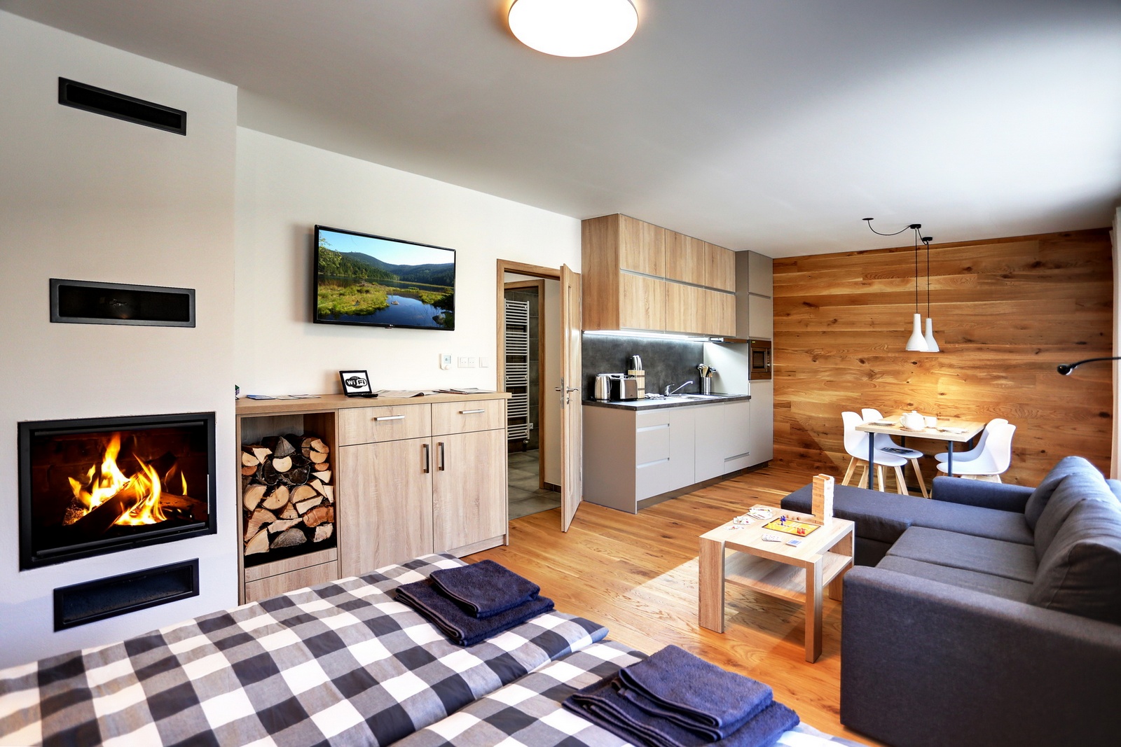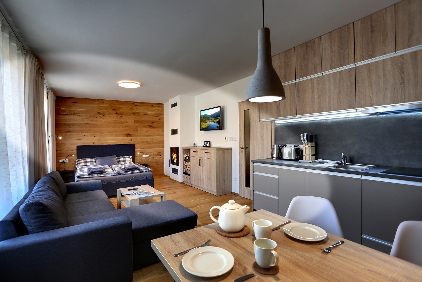 Velká manželská postel a pohodlná rozkládací pohovka poskytnou místo až pro 4 osoby